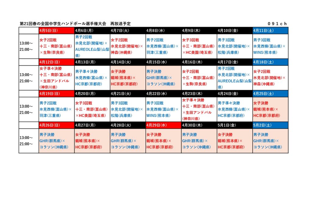 第21回春中ハンド放送予定