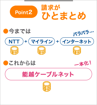 - 適用条件:ご連絡先電話番号にauケータイ番号が登録されている場合で、ケーブルプラス電話とauケータイのご登録契約者名が同じ、もしくはご登録住所が同じ場合に適用。ケーブルプラス電話、auひかり電話サービス(au one netを除く)以外については、「KDDIまとめて請求」のお申し込みが必要です。詳細については、auホームページにてご覧ください。